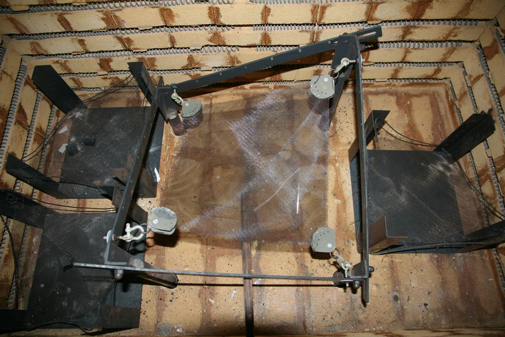 De mal bestaat uit vier hoekpunten welke in hoogte verstelbaar zijn. Daar tussenin wordt een zeer fijnmazig net bevestigd. Dit net bestaat uit een onder- en een bovenkant, waartussen de glasplaat gelegd kan worden. Uit onderzoek bleek dat hierdoor de mooiste vorm in de glasplaat verkregen kon worden.Het net wordt aan de hoekpunten bevestigd door middel van klemmen. Deze klemmen zijn zo bevestigd dat ze om zowel de horizontale als de verticale as vrij kunnen bewegen. Tevens is de klem zo ontworpen dat er meerdere glasplaten of platen van verschillende diktes tussen de twee netten geplaatst kunnen worden. Tussen de hoekpunten in worden kleinere klemmen geplaatst om het net als het ware in de gewenste vorm te kunnen geleiden.
